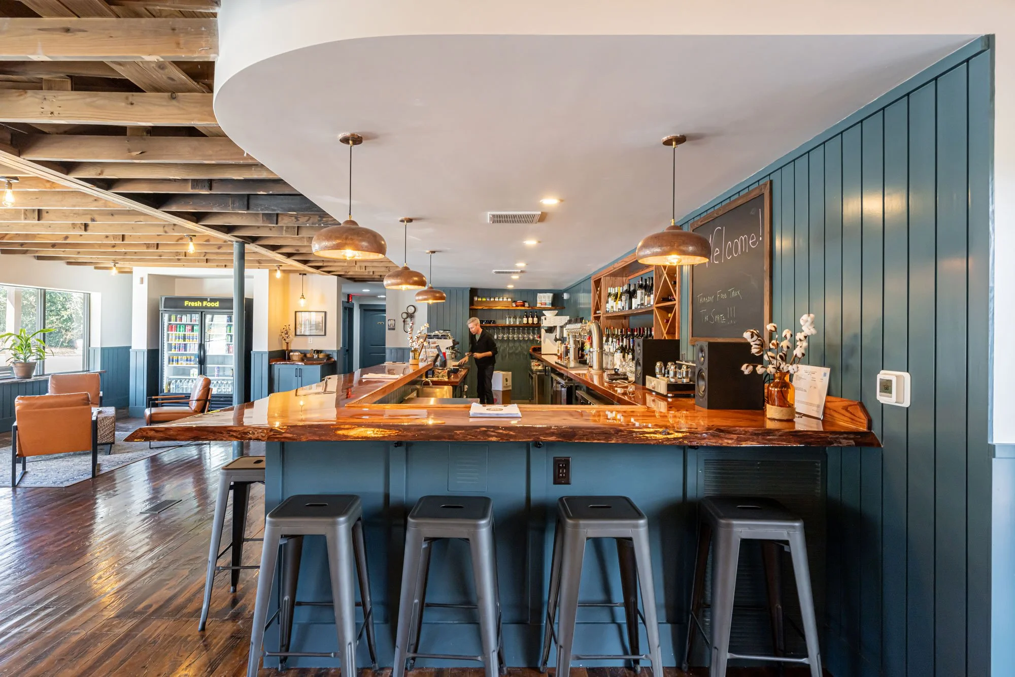 Originally built as Gasperson's Grocery & gas station back in 1958, when the surrounding area was mostly farmland, the Haywood Filling Station is now a community hub serving coffee, beer, and wine to Mills River locals. Layers of past remodels were peeled back to expose wood floors and beams to create a backdrop for the new bar and seating clad in deep blue paneling. A new deck was added to back to create outdoor seating overlooking a creek.